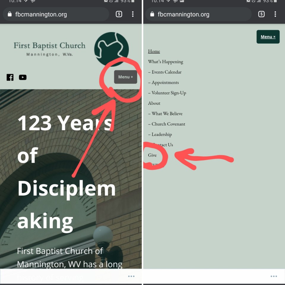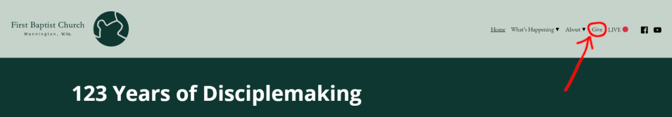 You can access online giving at any time on any device by going to give.fbcmannington.org or by clicking “Give” on the upper right corner menu of our website (in the dropdown menu on our mobile site).